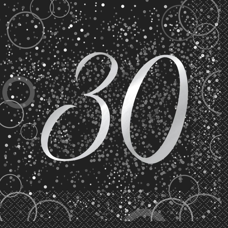 Flotte og funklende servietter til 30 års fødselsdag.Servietterne er i sort med tallet 30 i sølvDu får ialt 16 glitrende servietterServietterne er e helt normal størrelse og måler 33 cm x 33 cm, når de er foldet udDæk op med disse 30 års servi (Læs mere)
